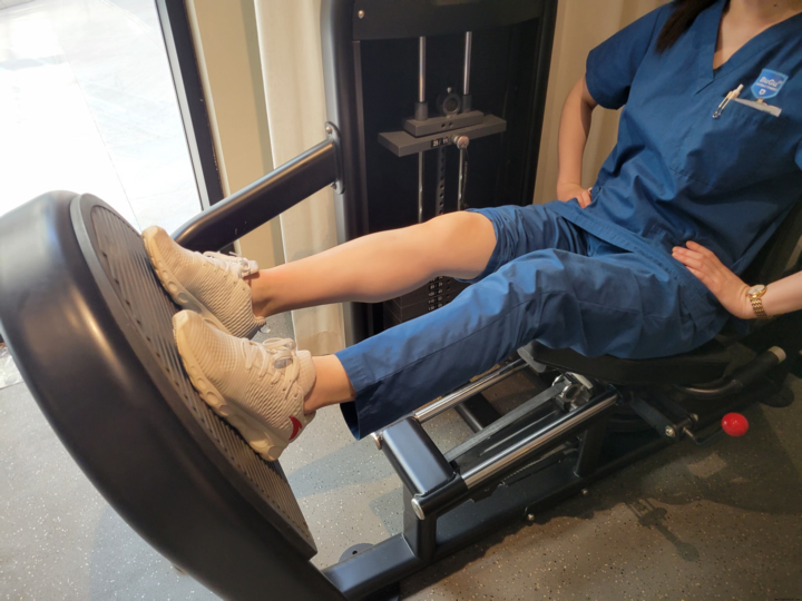 3.监控下进行肌肉训练。我们在前面提到了关节损伤后不仅会有肿胀和疼痛,每个人还会有不同程度的肌肉紧张和肌肉萎缩的情况,拉伸可以缓解肌肉紧张,而针对肌肉萎缩就需要在监控肿胀的同时进行康复训练。一边从温度和围度去监控肿胀变化,在控制肿胀的情况下逐渐增加肌肉力量,从卧位训练过渡到站立位训练,再到行走和负重训练,这样才能给关节以支撑保护,减少在站立、走路、坐起等动作当中关节的压力,从根本上防止肿胀的反复。
