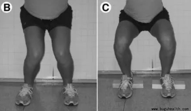 研究员重复同样的深蹲测试,不过他们在受测者的脚踝下垫了2寸木头,将他们的脚跟抬高。研究发现,会膝盖外翻的组别在进行深蹲时,比起没有垫木头时,膝盖外翻的角度减少了。此外,二组(膝盖会外翻组 及 膝盖不会外翻组)受测者,脚踝附近的肌肉活动减少了。