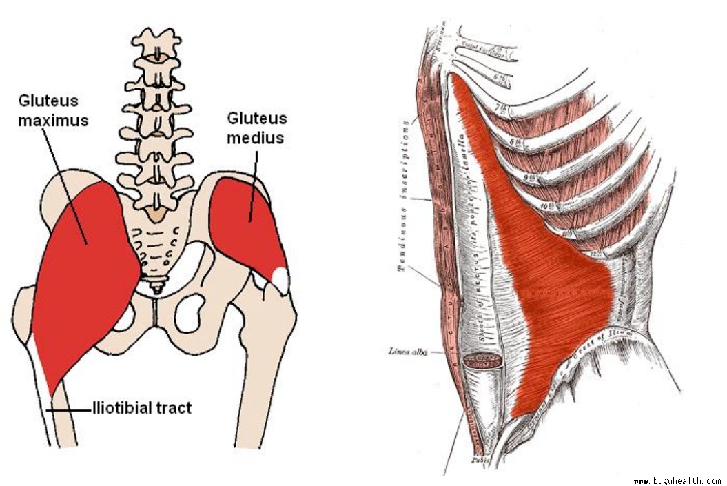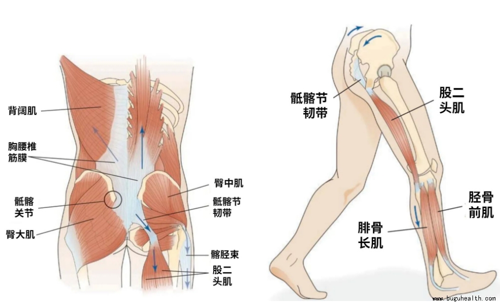 臀大肌和背阔肌与胸腰筋膜协同工作,形成后向斜侧子系统作为臀大肌活动不足和无法保持直立躯干位置的代偿机制,背阔肌可能协同主导(过度活动或紧张)以通过躯干、核心和骨盆提供稳定性。因为背阔肌穿过肩胛骨的下角并插入肱骨,它可以改变肩胛骨的旋转和肱骨头在关节窝内的瞬时旋转轴。