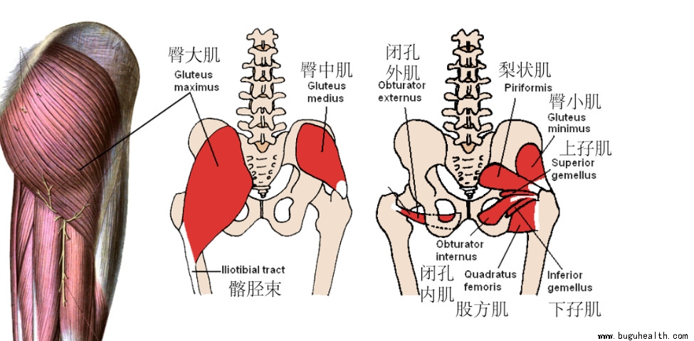 这些外旋肌位置很深,很大程度上被臀大肌覆盖。这组肌群包含六对肌肉,分别是梨状肌、闭孔内肌、闭孔外肌、上孖肌、下孖肌和股方肌。这些肌肉起自骨盆,远端附着于股骨大转子的上方和后方,因此当骨盆不动的时候,它们的收缩可以帮助髋关节外旋。