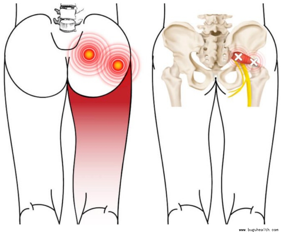 查找梨状肌的具体方法是先找到股骨大转子和骶骨,然后按摩这两点连线的中点。