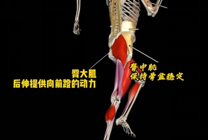 臀部有三块重要的肌肉,表层的臀大肌,里面的臀中肌,最深处的臀小肌。其中臀大肌最为强大有力,臀大肌对我们来说不仅仅是挺翘好看的问题,它可以在奔跑中提供后蹬的动力,兼具发挥稳定躯干的巨大作用。至于位于骨盆两侧的臀中肌和臀小肌,则是维持髋关节稳定的重要肌群,在另一侧腿向前迈开步子时提供必要的侧向稳定,避免重心偏向单侧,防止人体因重心不稳而跌倒,保持髋膝关节正确对位,保持稳定。