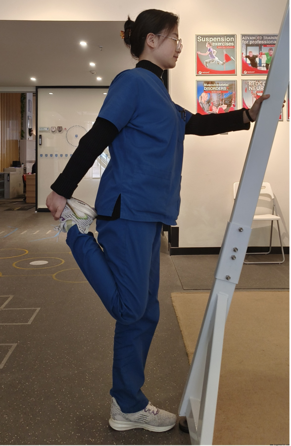 2.拉伸股四头肌:图中拉伸右侧股四头肌,拉伸时注意双侧大腿平行并且不发生髋外展,不出现身体的向前倾斜,以及不挺腰,感受大腿前方的拉伸感;