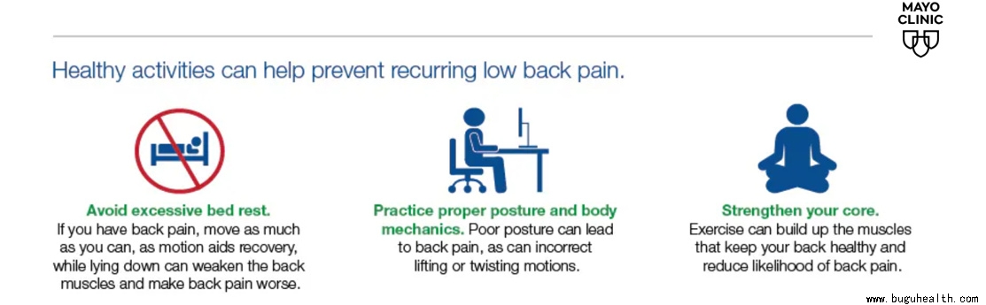 美国梅奥诊所(Mayo Clinic)指出健康的生活习惯可以预防腰疼复发:避免过度卧床休息,练习正确的姿势和发力,增加核心力量。