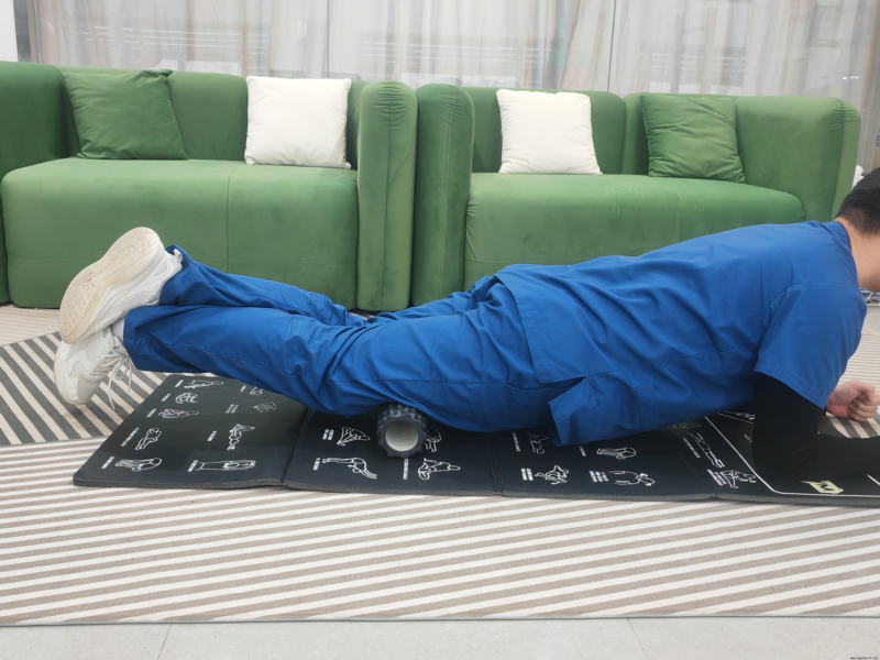 (1)身体呈俯卧姿势,双肘屈肘撑地,将泡沫轴置于左腿大腿下方,右腿叠放于左腿之上。双臂推地,带动身体前后移动,使泡沫轴在左腿大腿处慢慢来回滚动,并可在有明显酸痛点的位置进行局部反复滚动。滚动至规定时间后,换另一侧进行该动作。每侧30~60s/组,做2组。