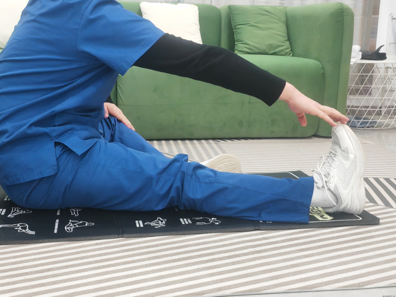 (2)身体呈坐姿,左腿伸直,右腿屈曲,右脚置于左腿内侧;躯干慢慢前倾,双手沿左腿向前移动,直至左腿腘绳肌有中等强度的拉伸感。保持20~30秒后,换另一侧进行该动作。