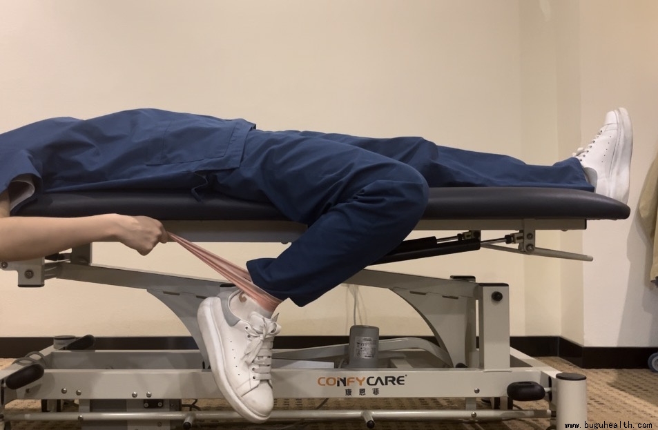 仰卧位,将要牵拉侧的腿垂于床外,屈曲膝关节,使用弹力带,一端拉住踝关节,一端由在自己手中,胳膊发力带动踝关节向上移动,可感受到股四头肌的拉伸感。拉伸到末端停30s,一组5次,一天2组。
