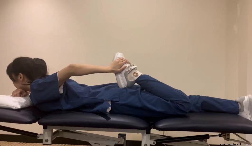 俯卧位,用手拉住脚背,手臂发力使脚贴近自己臀部。注意:过程中骨盆应保持中立位,不可挺肚子或将骨盆抬离床面。拉伸到末端停30s,一组5次,一天2组。