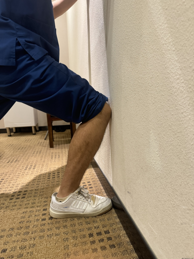 踝关节活动度练习:利用膝关节顶墙,观察脚尖距离墙面的距离,来判断踝关节活动度的好坏。同样可以作为练习动作,在踝关节活动末端反复进行。