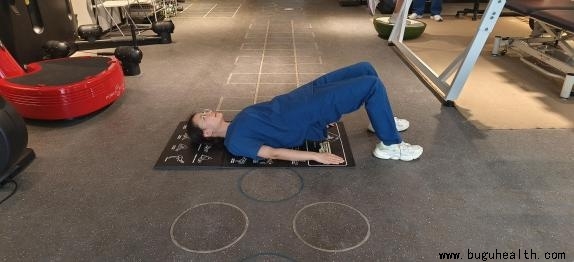 双腿臀桥:屈曲双腿,臀部向中间收紧,将臀部抬离床面,每天进行15次,感受臀部后方和大腿后方的肌肉发力感。