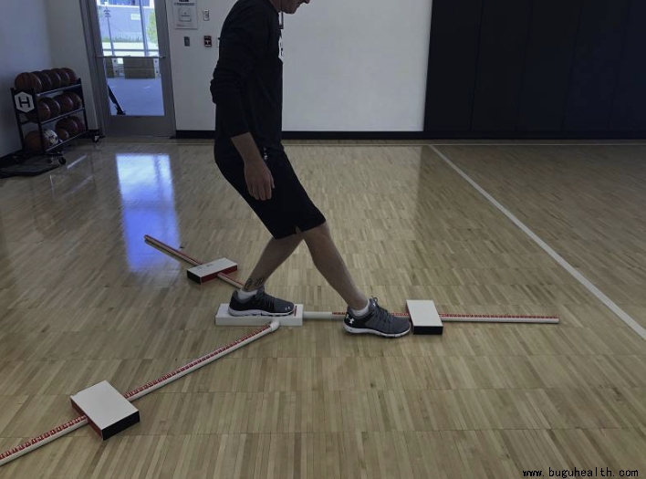 Y平衡训练:患侧单腿站立,健侧脚去触碰三个不同方向的障碍物,并保持患侧下肢稳定;